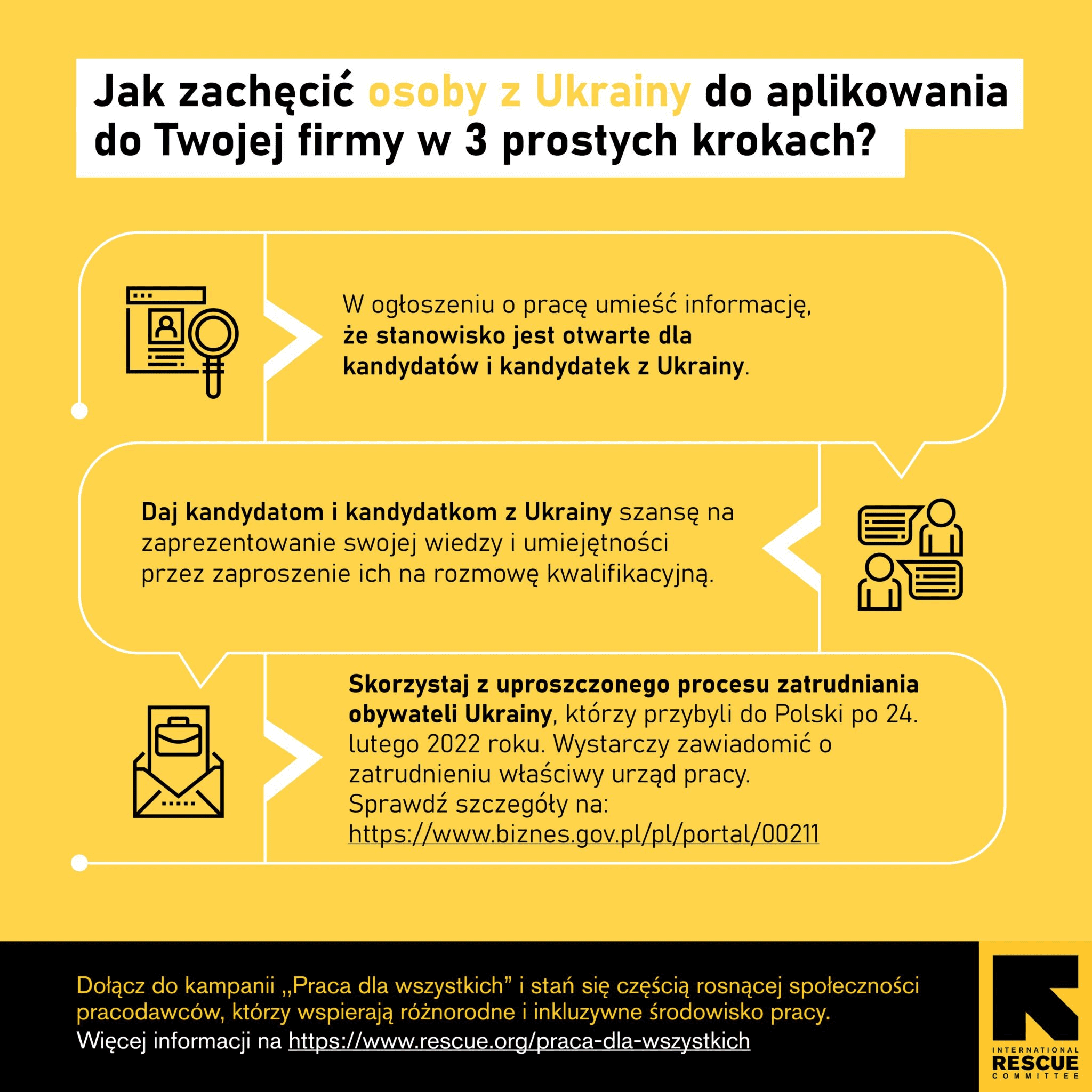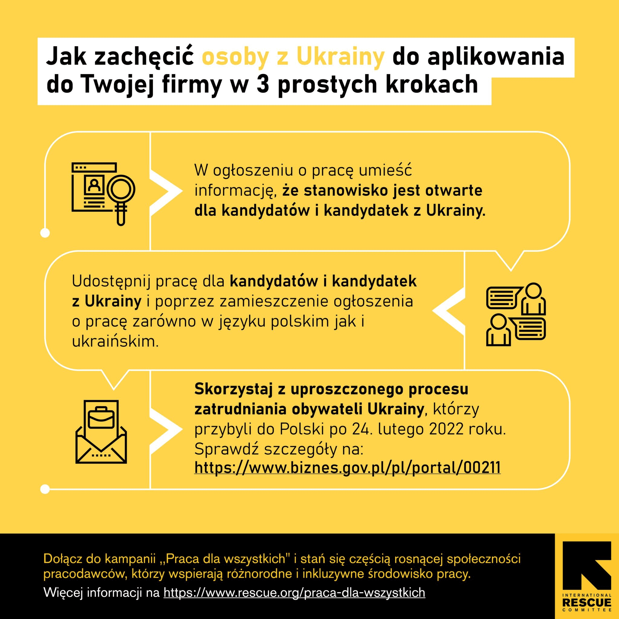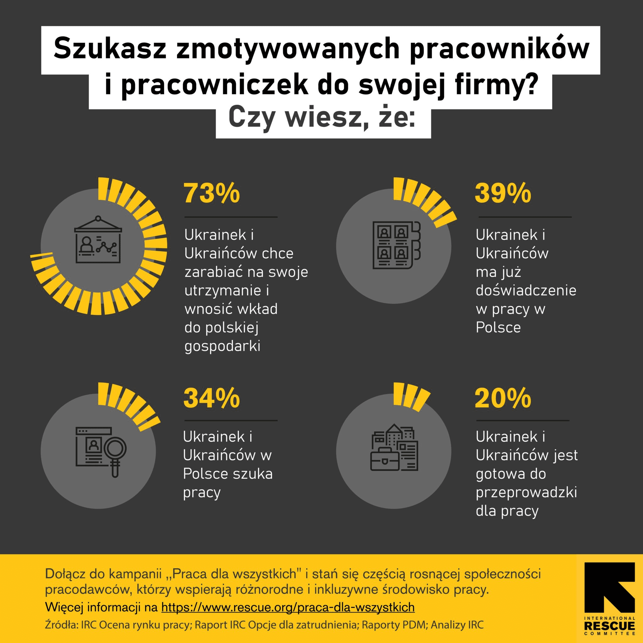 У кампанії «Робота для всіх» IRC показує, що ідея роботи для всіх — незалежно від країни походження — можлива, хоча часто вимагає додаткових зобов’язань, підтримки або зміни культури роботи в компанії. В основу кампанії покладено ідею співпраці з HR-спільнотою, підприємцями та представлення історій людей з України, які знайшли роботу в Польщі та будують тут успішну кар’єру.